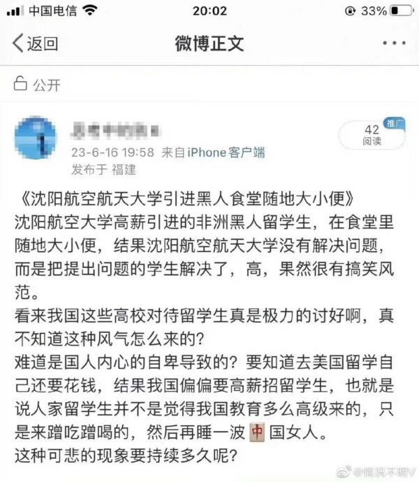 近日網上熱傳多張照片顯示,有非裔人士在公共場合小解。爆料者指,事發6月10日沈陽航空航天大學南區食堂,該校壹名非洲留學生在眾目睽睽之下對著筷子籠撒尿。事後未見對涉事留學生的處理通告,反倒是拍照和在網上曝光此事的中國學生被校方“嚴肅處理”。