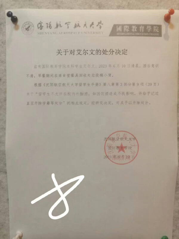 隨後,網上傳出壹份校內張貼的處分通告,上寫壹名留學生因“酒後意識不清”,早餐期間在食堂餐具回收處小便,學校決定予以開除。