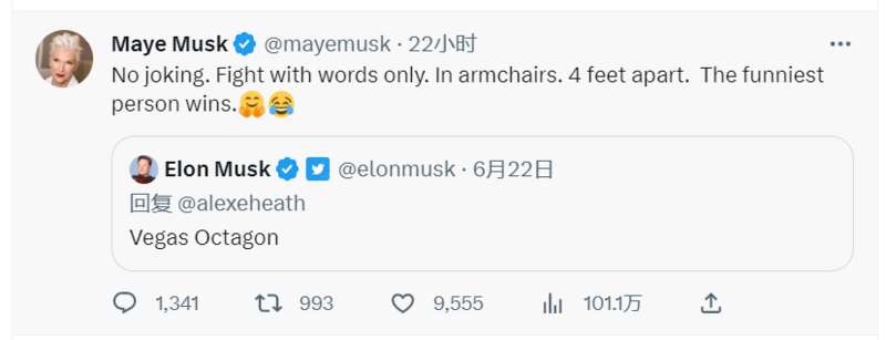 在壹眾“吃瓜群眾”的圍觀下,這場兩位億萬富翁之間的“約架”似乎即將要發生,但此時馬斯克的母親著急了,連發推文稱她取消了這場比賽,並勸馬斯克不要開玩笑。