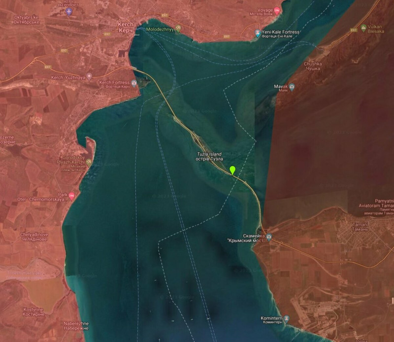 靠近俄羅斯克拉斯諾達爾的第 145 根橋墩(綠點標示處)遭飛彈攻擊。 圖:翻攝自推特@AndrewPerpetua- 新聞來源於其它媒體,內容不代表本站立場!