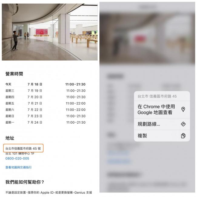 用新版Chrome瀏覽網頁,只要頁面出現“地址”,長按地址後,Chrome就能自動辨識,進而啟用在Chrome中使用Google地圖查看、規劃路線、複製地址等功能,查看地圖會直接跳出小視窗,不用再跳轉到Google地圖App。