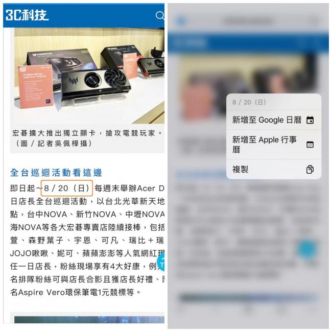 如同上述,Chrome偵測到日期,長按之後,就會出現新增到Google日歷或App行事歷,以及複製。