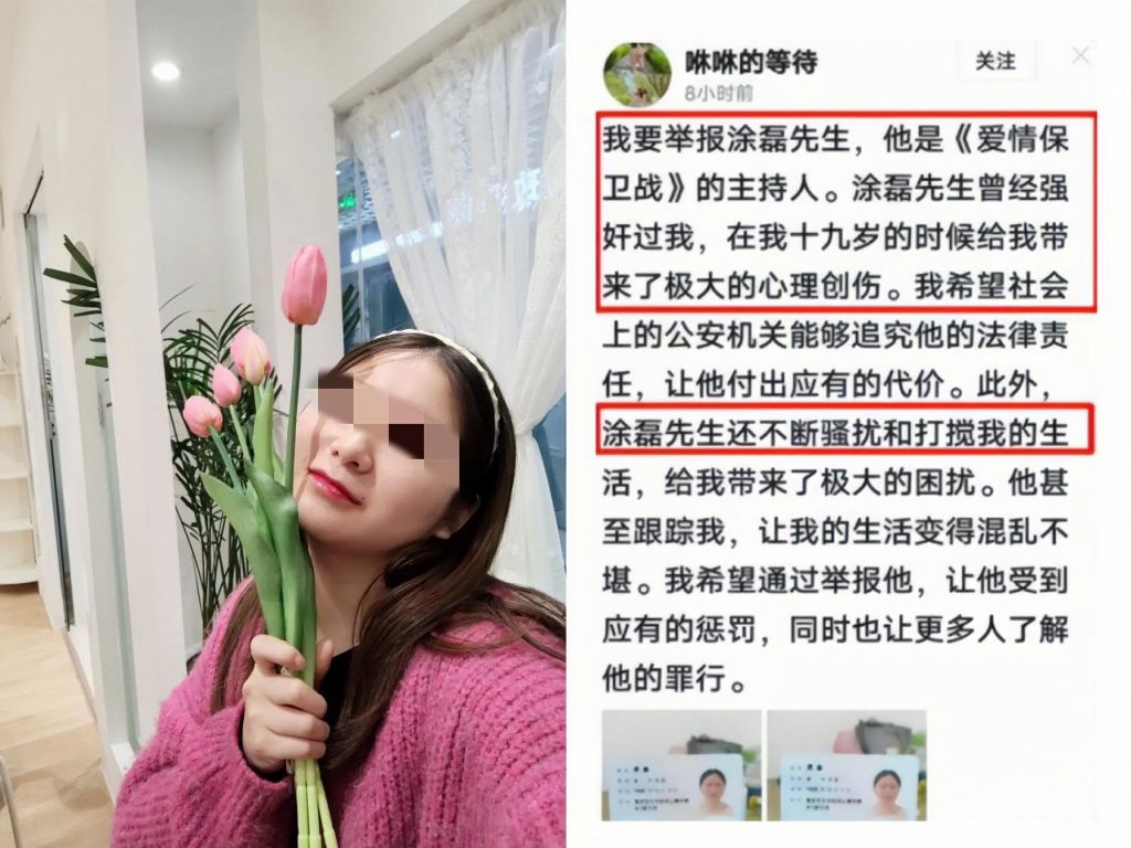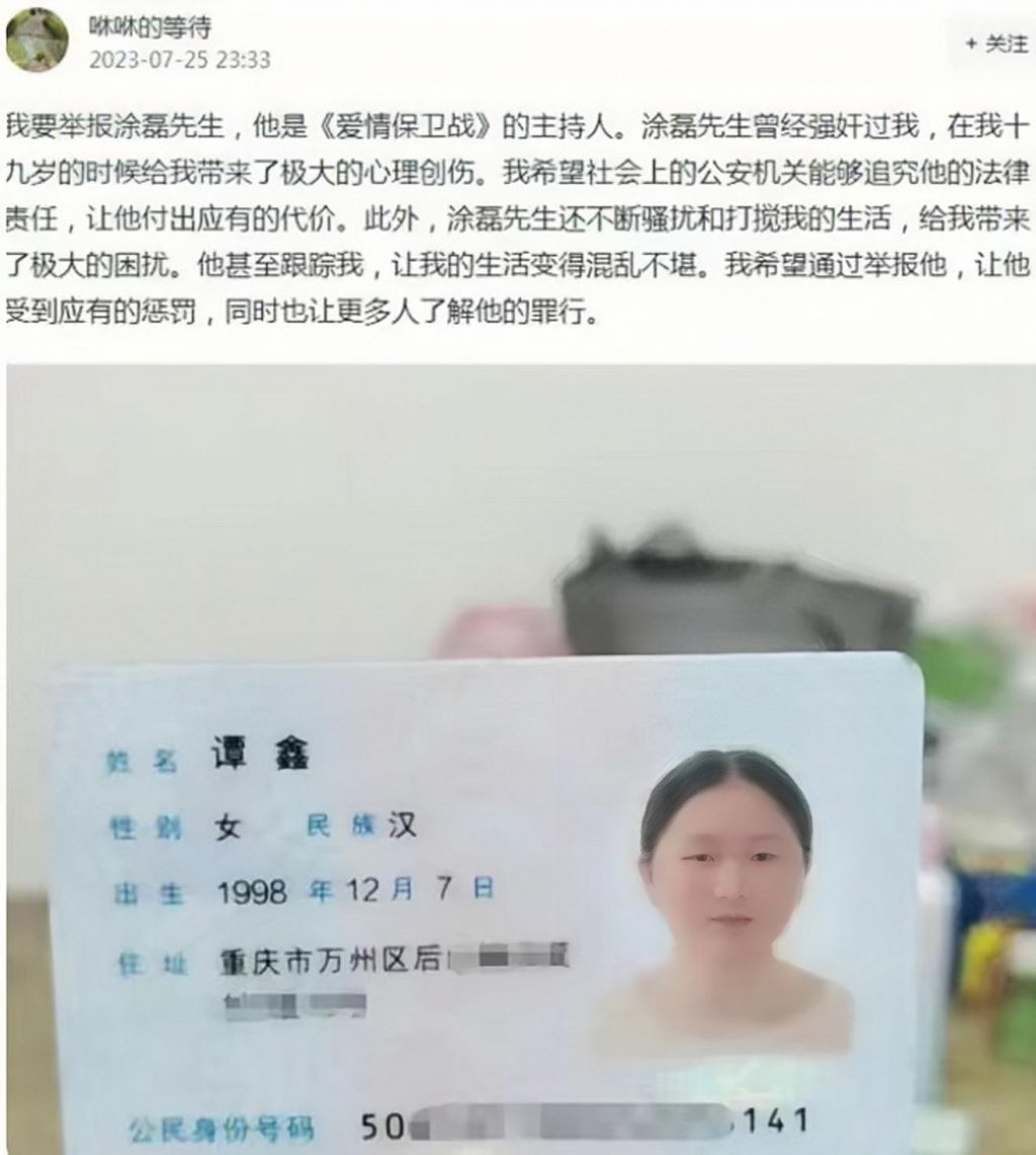 壹名叫“譚鑫”的女子,在社交平台上,舉著身份證實名舉報塗磊6年前強奸過自己。