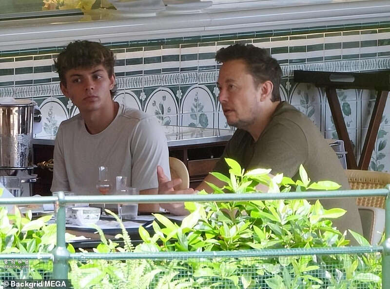 而在不遠處,X娃的爸爸正坐在露天餐廳裡和他人認真地聊著天,似乎有什麼重要的事情要商談。坐在“現實版鋼鐵俠”身旁的,是他的17歲叁胞胎兒子中的壹個,名叫撒克遜·馬斯克,也就是X娃的同父異母的哥哥。