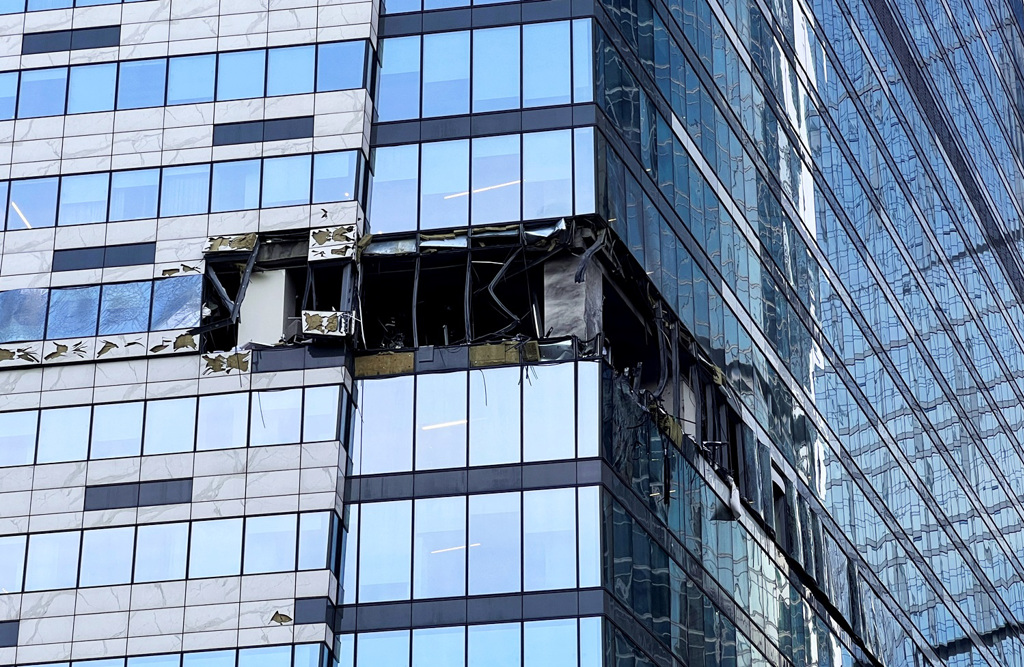 俄罗斯指控乌克兰无人机30日凌晨空袭莫斯科金融区,酿成高楼大厦受损。图为一栋大楼遇袭后的毁损情形。(图/路透社)