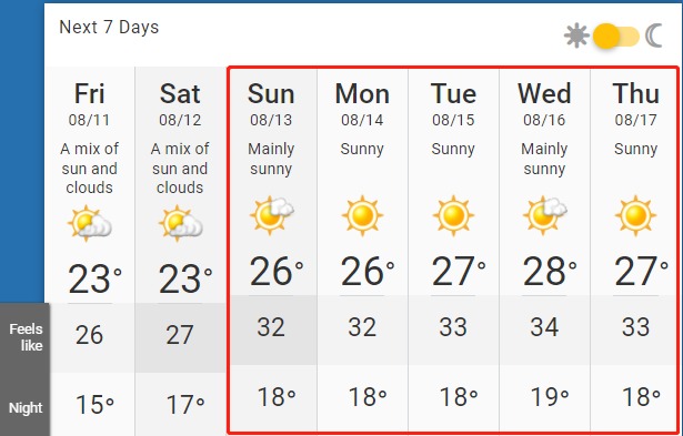 根據天氣網的預測,低陸平原大部分地區自周日(8月13號)開始,下周氣溫異常炎熱。