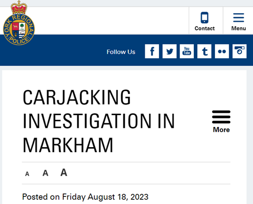 加西網報道:安省約克地區警方的劫持小組的調查人員正在尋找萬錦市武裝劫車事件的嫌疑人。