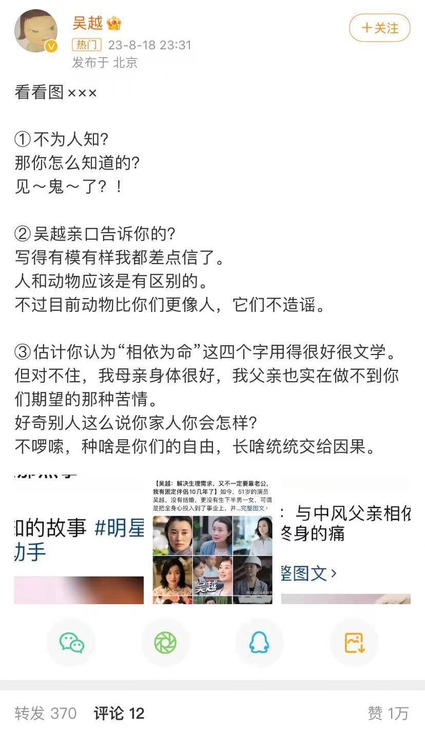 還有人寫吳越的父親中風,不婚不育成了父親終身的痛。(這完全是幹涉了別人的私生活,非常的不禮貌,顯得很低俗)