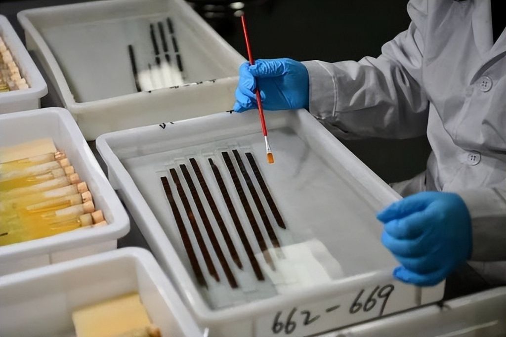 壹支支“天回醫簡”被放置在蒸餾水中,成都文物考古研究院文保中心工作人員在進行清理工作。