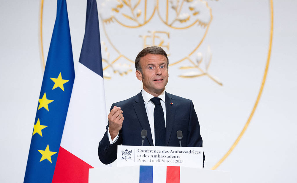 当地时间2023年8月28日,法国巴黎,法国总统马克龙在爱丽舍宫举行的大使会议上发表讲话。视觉中国 图