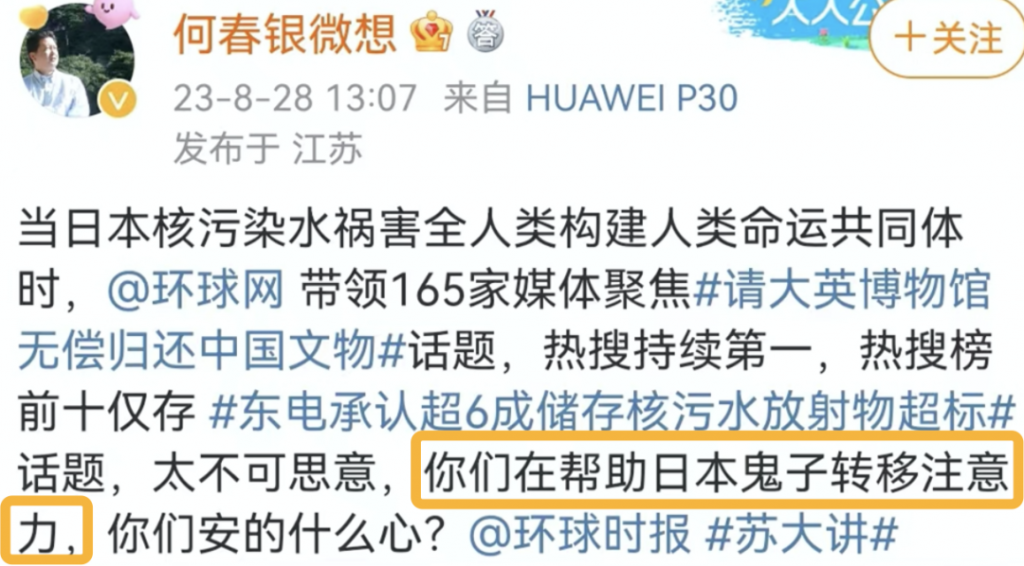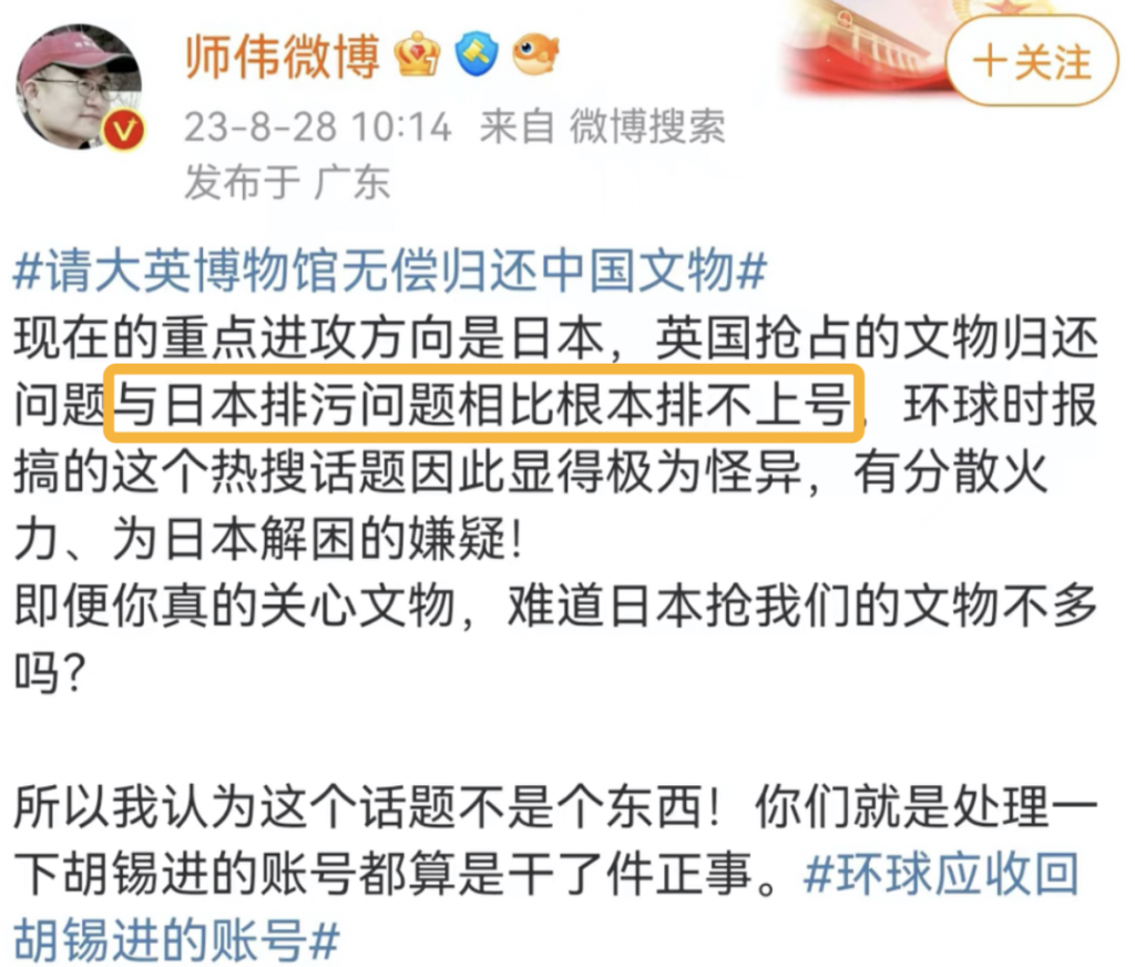 比如常年縱橫在“愛國”界的師偉就沒能忍住,直接下場怒批環球時報,說“英國搶的那點文物跟日本核污水沒法比,環球時報行為怪異,為日本在分散火力”,甚至他還要求收回胡錫進的賬號……