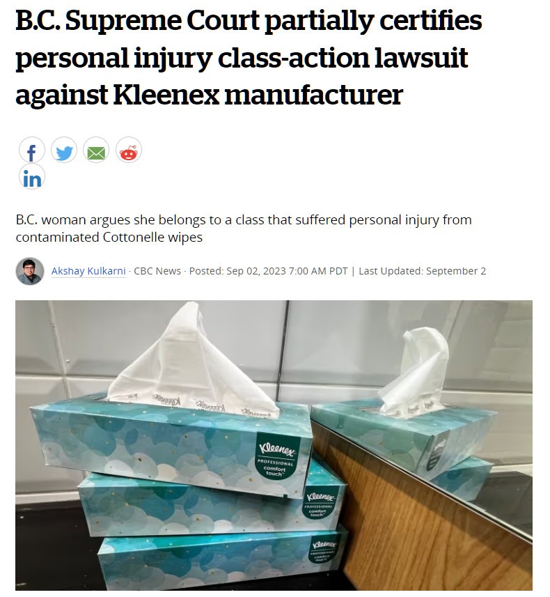據CBC NEWS消息,該訴訟由BC省居民鮑曼 Linda Bowman 提出,她於 2020 年 7 月 17 日在 Costco 購買了 Cottonelle 濕巾。