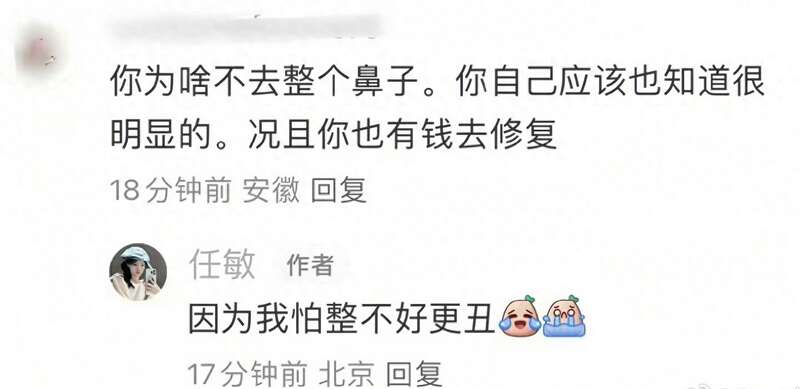 網友在任敏的評論區留言勸說:“你為啥不去整個鼻子,你自己應該也知道很明顯的。況且你也有錢去修復。”