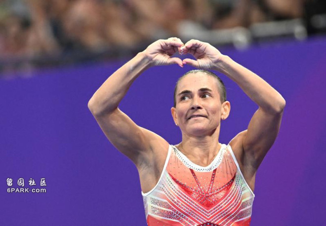 48歲的丘索維金娜完成第贰跳後,向觀眾比出愛心。(新華社)