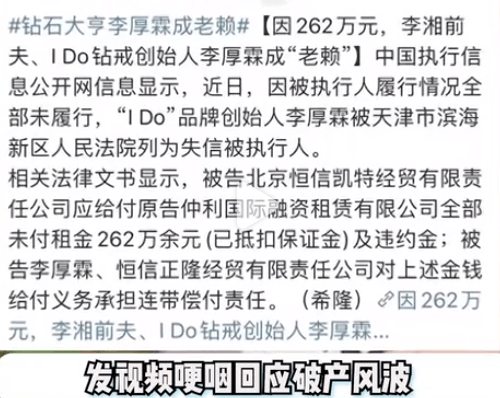 此前,據中國執行信息公開網信息顯示,因被執行人履行情況全部未履行,“I Do”鑽戒品牌創始人李厚霖被天津市濱海新區人民法院列為失信被執行人。