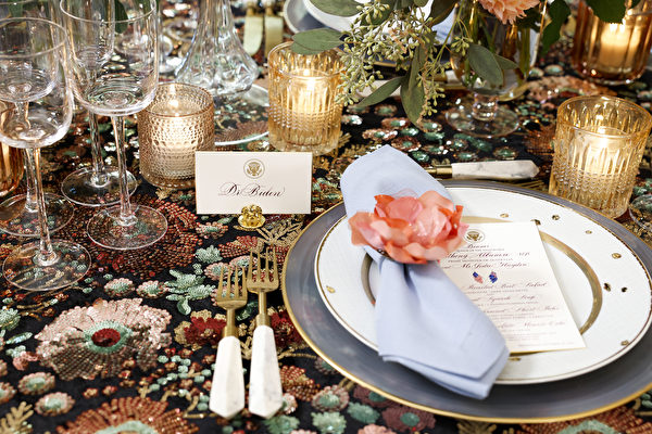 國宴期間,兩國首腦將會品嘗南瓜湯、牛小排和榛子巧克力慕斯蛋糕等精美佳肴。此外,餐桌上的插花設計融入了兩國的國花。