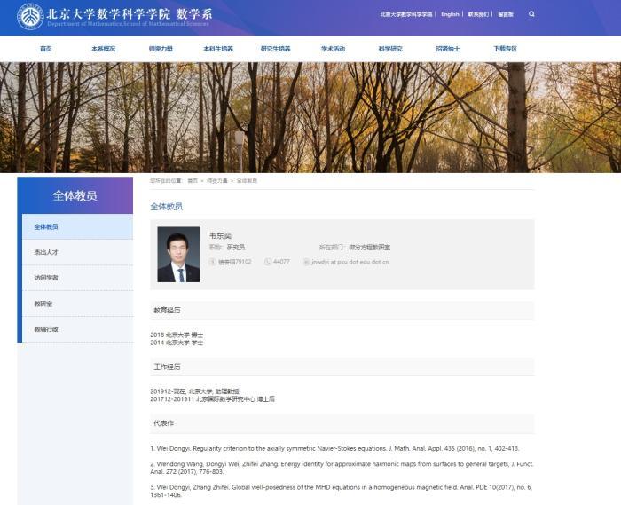 目前,北京大学数学科学学院数学系官网上,“全体教员”一栏中仍挂有韦东奕的简历信息。截至发稿,中新网尚未联系到韦东奕本人。