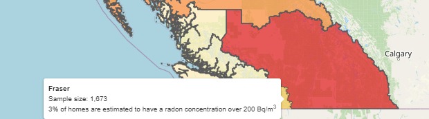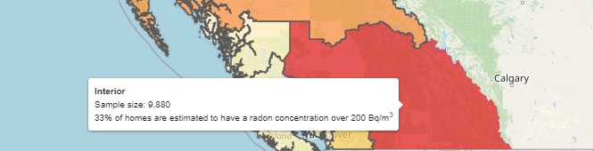 其中最严重的是BC省内陆,33%的屋子氡气超出浓度低于每立方米 200 贝克勒尔 (Bq/m3)的标准。