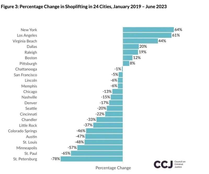 位居第二的是达拉斯排名,在2023年上半年,报告的入店行窃事件数量增加了73%。