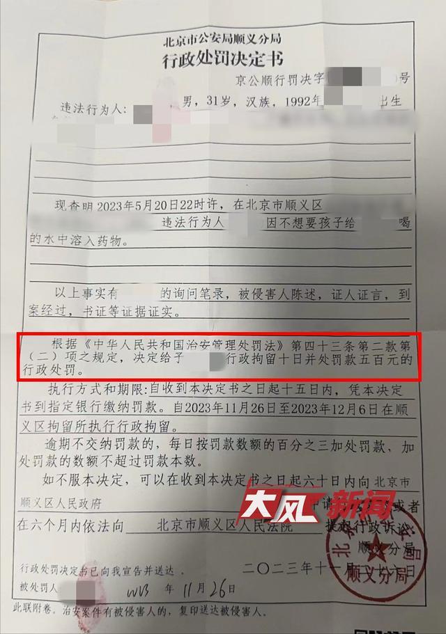 王女士提供的北京市公安局順義分局11月26日出具的行政處罰決定書顯示,現查明,2023年5月20日22時許,在北京市順義區某小區,違法行為人因不想要孩子,給王女士喝的水中溶入藥物。