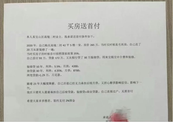 12月3日,網上傳出上海某處張貼的“買房送首付”的廣告。廣告標題雖然為“買房”,實際上就是“送房”。房主承諾,只要有人願意承擔後續貸款,就直接過戶。