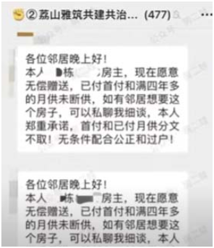 今年11月初,網上也曾傳出業主群截圖顯示,廣州市從化區碧桂園荔山雅築也有業主發廣告,願意“免費送房”。該業主說,自己已供房貸肆年多,現在不要首付和已付月供,只要有人願意接手,無條件過戶。