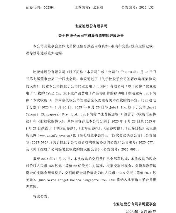 12月30日消息,比亞迪股份有限公司發布公告稱,其控股子公司比亞迪電子(國際)有限公司完成對Jabil Inc.旗下子公司 Jabil Circuit (Singapore) Pte. Ltd.(以下簡稱“捷普新加坡”)的收購。