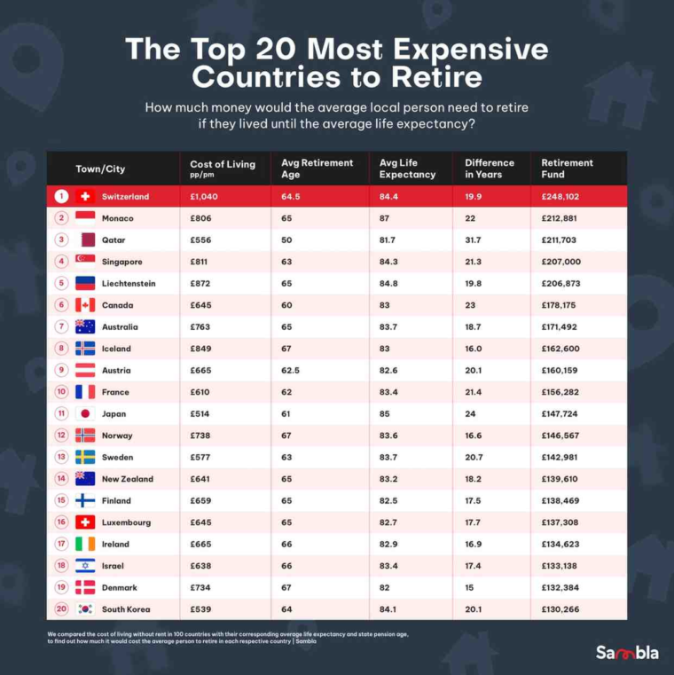 瑞士的無房租每月生活費用為1,040 英鎊(1,700 加元),居民需要為退休儲蓄約 248,102 英鎊(400,700 加元)。