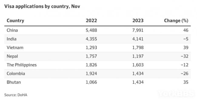 降幅最大的留学生来源国是尼泊尔,下降了32%,哥伦比亚下降了26%。但来自中国的申请大幅增长,较上年同期增长46%,达到7991份。来自越南的申请也大幅增长了39%。
