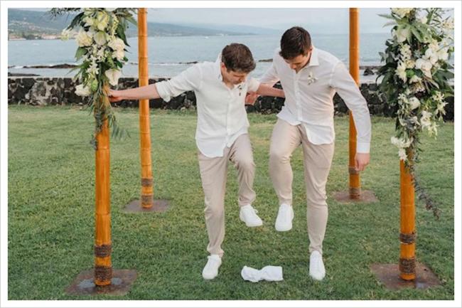 “新娘”奧利弗·穆赫林(Oliver Mulhern),是壹位曾在Meta AI公司擔任軟件工程師的傑出人才。壹對新人身著白色襯衫和白色球鞋,按照傳統的猶太婚俗,踩碎了壹支裹在白布裡的玻璃杯。