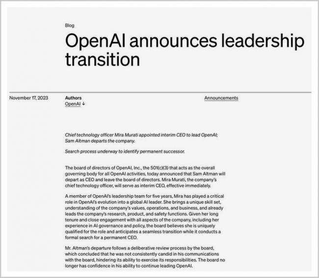 2023年11月17日,剛剛發布完ChatGPT-4 turbo的OpenAI上演了壹出狗血宮斗劇:數日前還以硅谷新王姿態在Open AI首次開發者大會上激情演講,宣告人類進入新紀元的Open AI CEO山姆·阿爾特曼(Sam Altman),忽然收到了董事會發來的壹紙開除郵件。