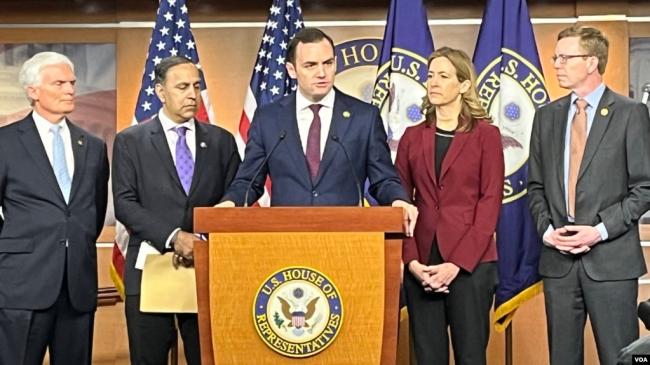 美國國會眾議員中共問題特設委員會主席麥克·加拉格爾(圖中)2024年3月6日在國會山召開記者會發表講話。(美國之音記者李逸華攝)