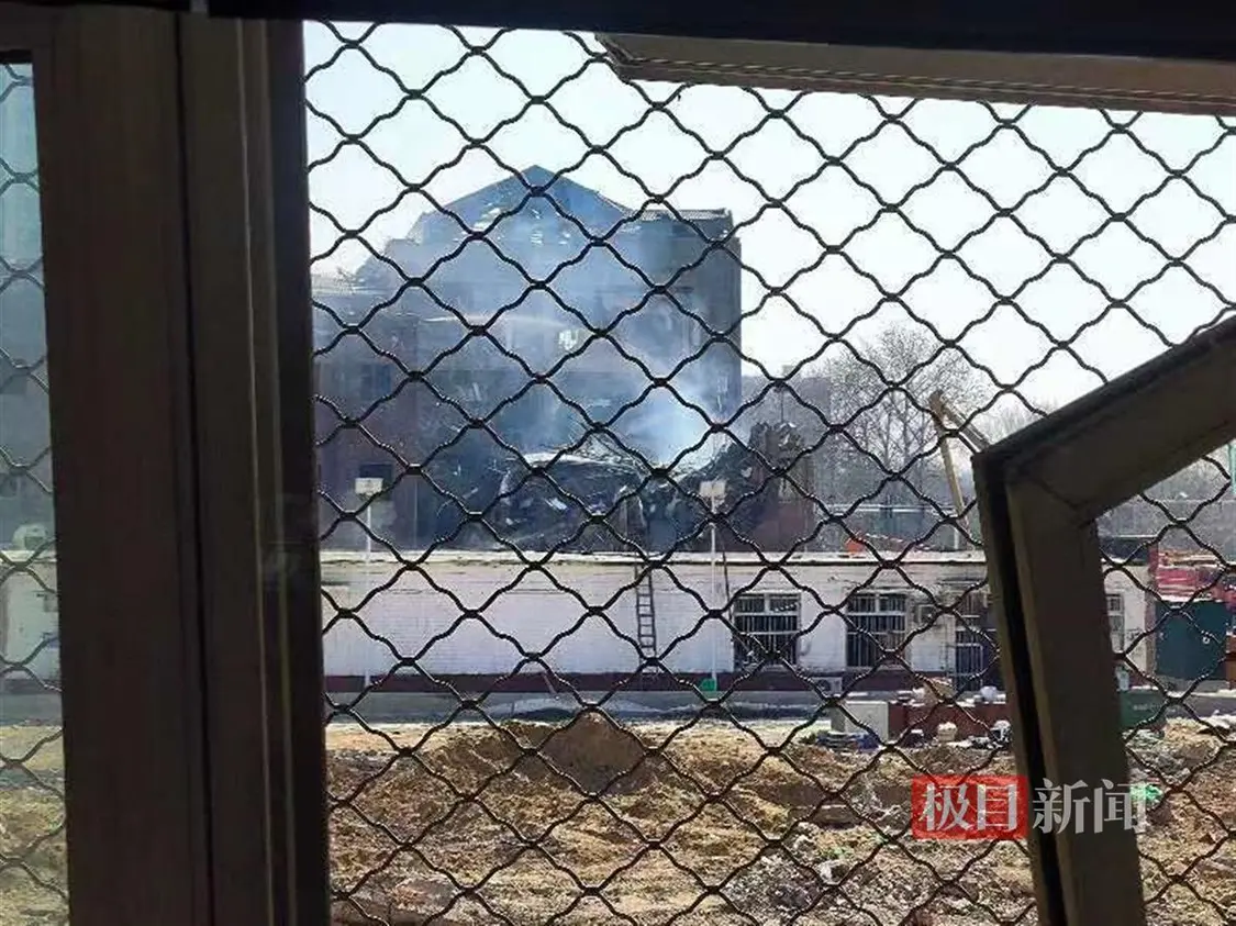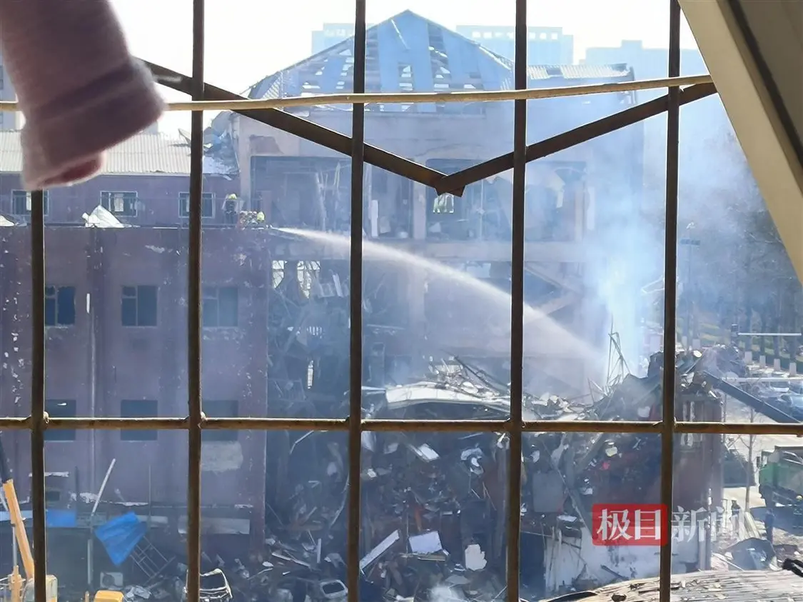 13日中午,極目新聞記者在現場看到,距離事發地不到1公裡的海油大街與迎賓路交叉口已經拉起了警戒線,迎賓路上停著拾多輛消防車,消防人員正在現場清理救援,還有挖掘機在做清理工作。爆燃樓棟還在冒著煙,救援部門仍在使用機器救援。