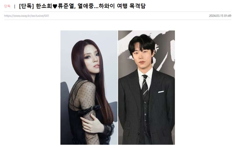 這段戀情緋聞源自壹位自稱目擊到兩人約會現場的粉絲。該粉絲在社交媒體平台中發文稱:“看到(我住的這家)酒店泳池邊有韓國頂級演員在玩”,並標注了韓素希和柳俊烈各自的代表作品——《無法抗拒的他》和《請回答1988》。
