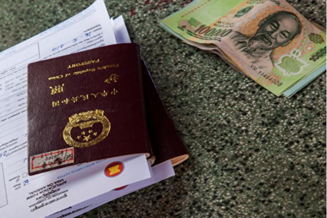 图为柬埔寨巴维特过境点一本用于申请柬埔寨签证的中国护照。(Omar Havana/Getty Images)