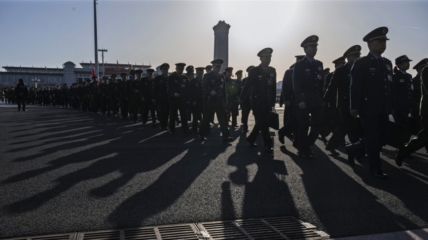 中共軍委政法委書記升上將有貓膩。資料圖,2024年3月8日,參加中共人大的軍隊代表抵達北京人民大會堂外。(Photo by Kevin Frayer/Getty Images)