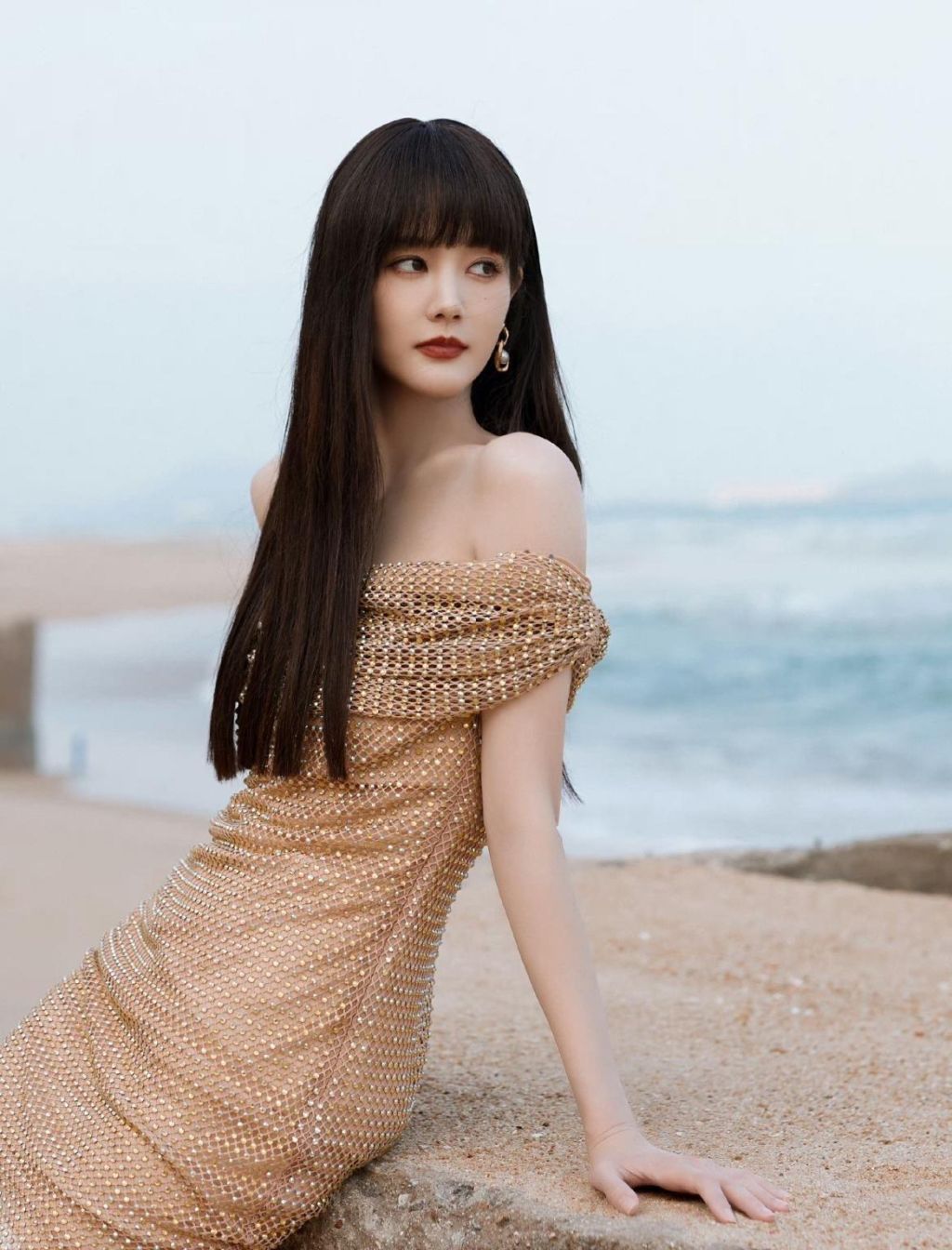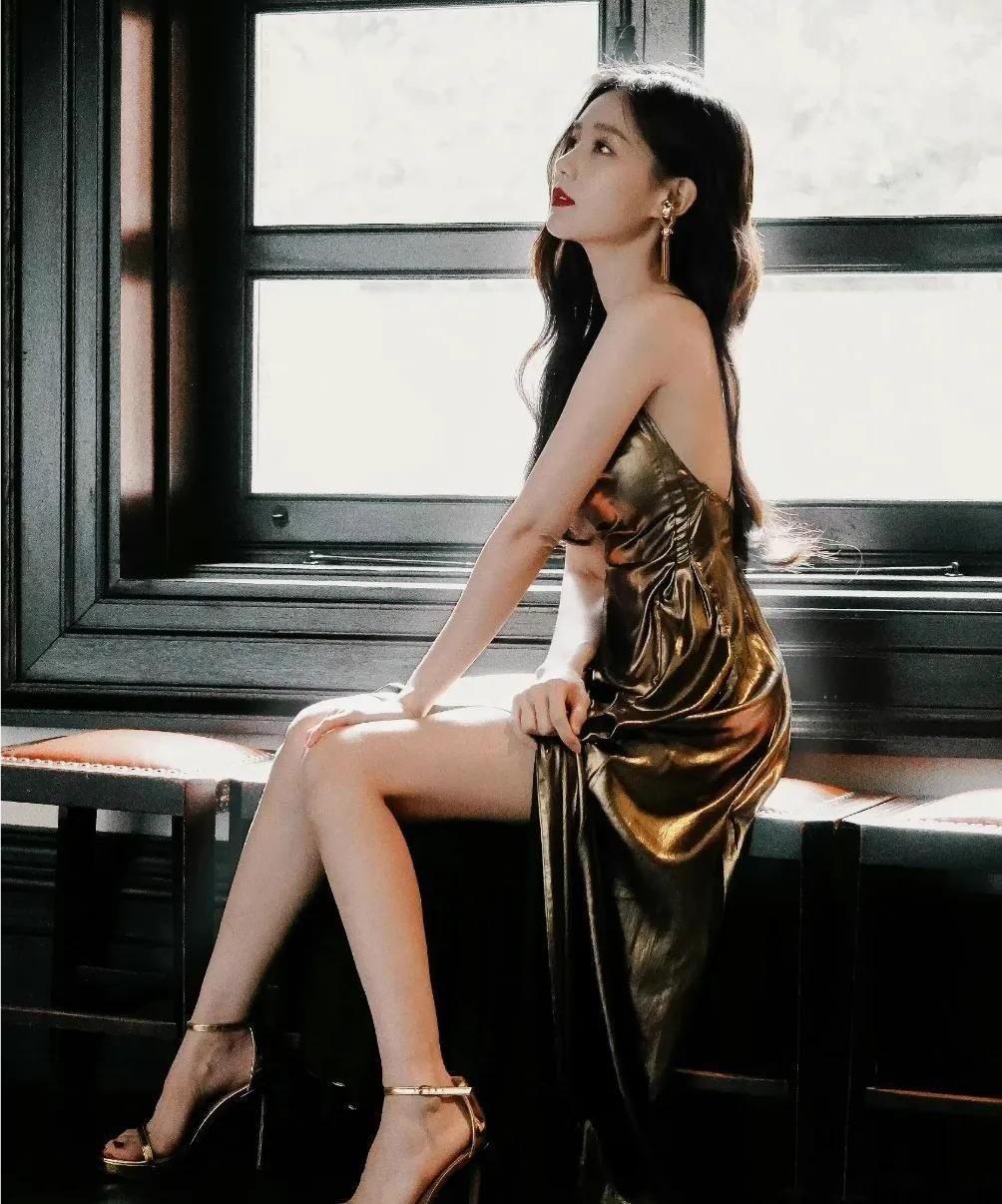 转换至另一造型,李一桐身穿的鎏金色吊带裙,彰显尊贵与成熟风韵,鎏金色彩自带奢华气息,搭配简约一字带高跟鞋,尽显高雅气质。