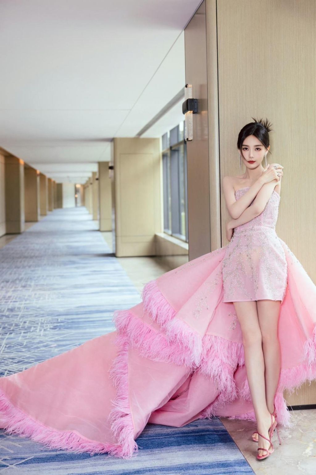 再次回归粉色系,李一桐选穿的粉色抹胸裙,结合拖尾设计,既展现了甜美气息,也不失女王风范,短前摆设计巧妙拉长腿部线条,配以高跟鞋,更显腿部修长。
