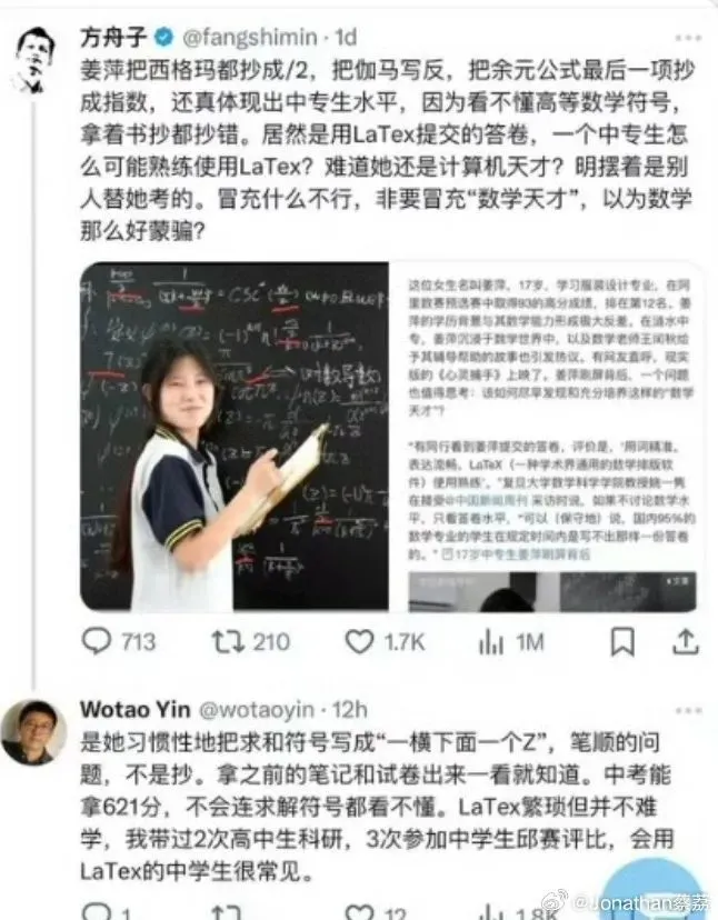 印卧涛:是她习惯性地把求和符号写成“一横下面一个Z",笔顺的问题,不是抄。拿之前的笔记和试卷出来一看就知道。中考能拿621分,不会连求解符号都看不懂。LaTex繁琐但并不难学,我带过2次高中生科研,3次参加中学生邱赛评比,会用 LaTex的中学生很常见。