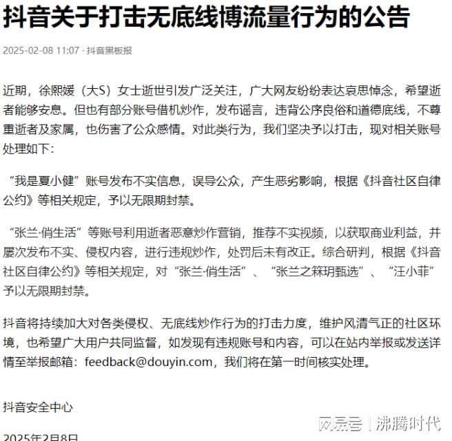 公告的核心内容是:涉及张兰、汪小菲的多个核心账号,全部被“无限期封禁”。