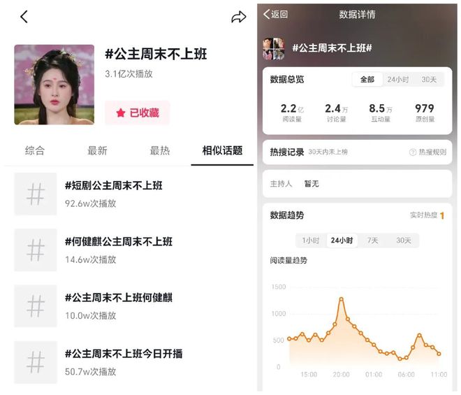 从话题量来看,截至发稿当日,"公主周末不上班"相关话题,抖音话题量超3亿,微博话题阅读量达2.2亿,互动量超8万。