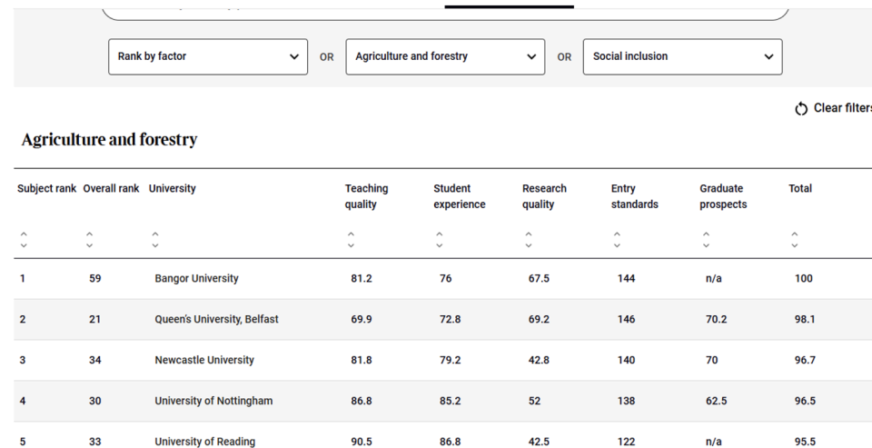 一些整体排名一般的大学,往往能在特定学科中脱颖而出。例如:名不经传的班戈大学在农业与林业领域位列全英第一,尽管总体排名仅第59位,却超越了贝尔法斯特女王大学与纽卡斯尔大学;经济学排名第一的华威大学则位列第八,力压牛津与剑桥。