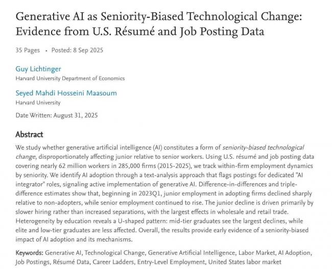 中产爸妈费尽千辛万苦把孩子托举到了还算不错的大学,以为毕业后能找到好工作,一世安稳,但这篇论文发现,普娃被AI伤得最深。