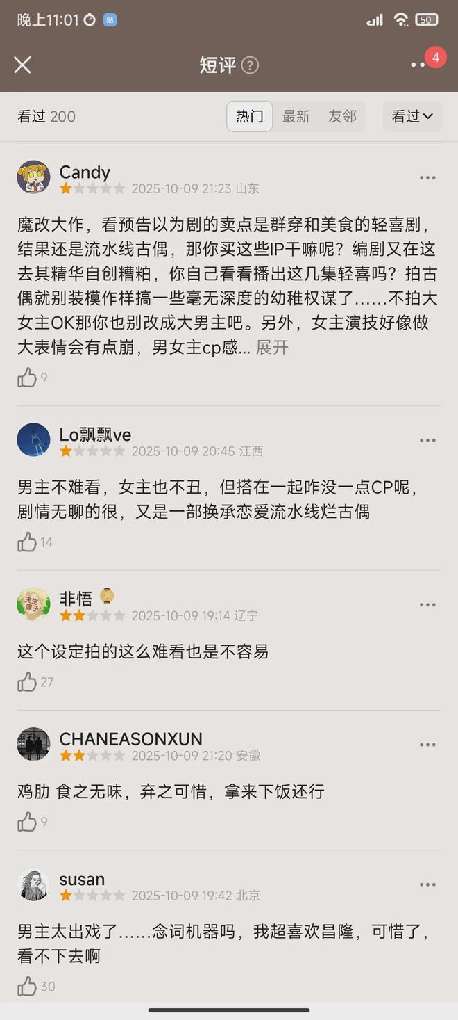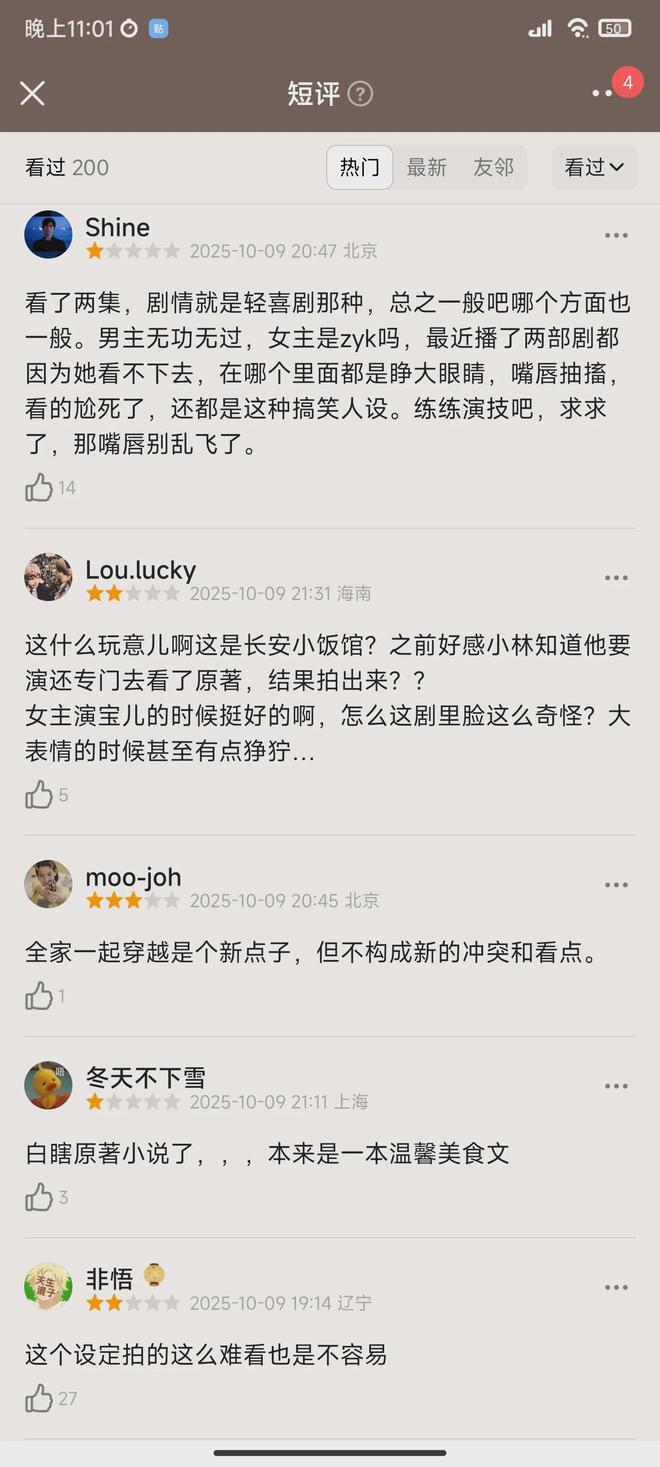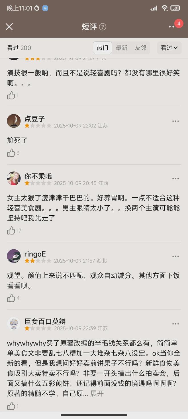 首播口碑也出来了,评价可谓是好坏掺半。差评主要集中在魔改原着上,观众评价一针见血,就是把《长安小饭馆》改得妈都不认识。原着没有穿越,本来是很温馨的创业美食文。改成剧后,好像除了主角名字,就没什么关系了。以美食为主的剧,4集过去除了煎饼果子,没有一道像样的菜展示,显得有些敷衍。