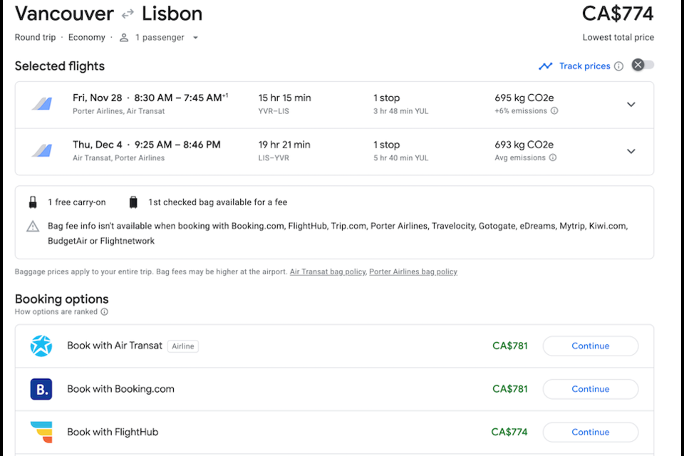 例如 11月28日从温哥华国际机场出发,12月4日从里斯本的温贝托·德尔加多机场 (LIS) 返回的票价为774元。行程需在蒙特利尔转机停留将近四个小时,回程则在蒙特利尔转机停留五小时四十分钟。