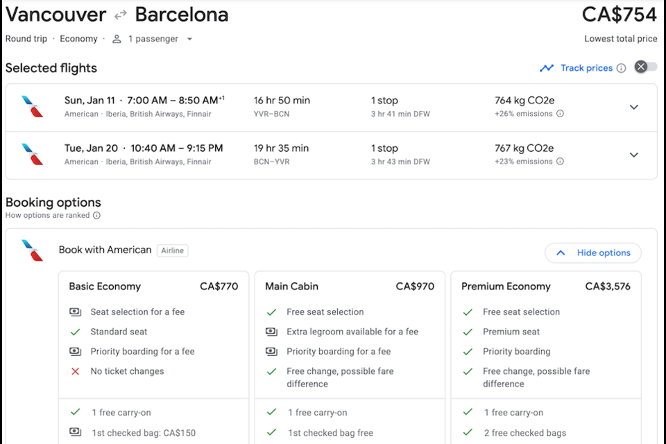 例如 2026年1月11日从温哥华国际机场出发,2026年1月20日从巴塞罗那-埃尔普拉特机场(BCN)返回的航班,乘坐美国航空的往返票价为770元。去程需在达拉斯转机停留约3小时41分钟,回程在达拉斯转机停留约3小时43分钟。