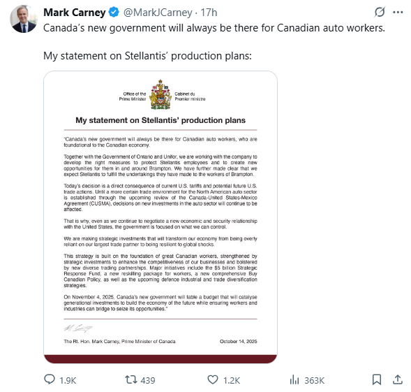 总理马克·卡尼(Mark Carney)在周二晚间发表声明表示,联邦政府将“始终与加拿大汽车工人站在一起”