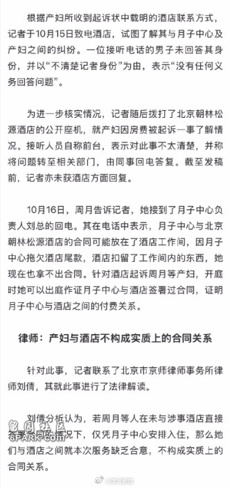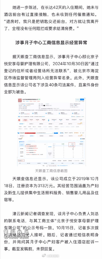 记者调查发现,涉事月子中心“北京子悦安享母婴护理有限公司”已被列入经营异常名录,该公司涉及40起司法案件。酒店方未就此事回应采访,而月子中心负责人刘总表示,愿出庭证明月子中心与酒店之间存在合同关系。