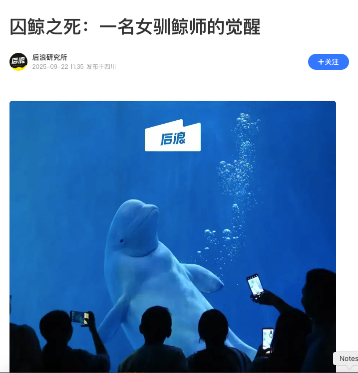 后浪研究所发布的一篇文章:《一名女驯鲸师的觉醒》。这篇文章告诉大家,海豚会因为过度表演而累死,圈养的鲸鱼会流泪,会自杀,也会杀人。