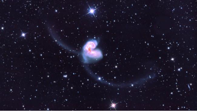 这两个编号为NGC 4038和NGC 4039的星系对,被称为触须星系(Antennae galaxies),距离我们银河系约4500光年远。它实际上是两座在交互作用下、正在合并中的星系。